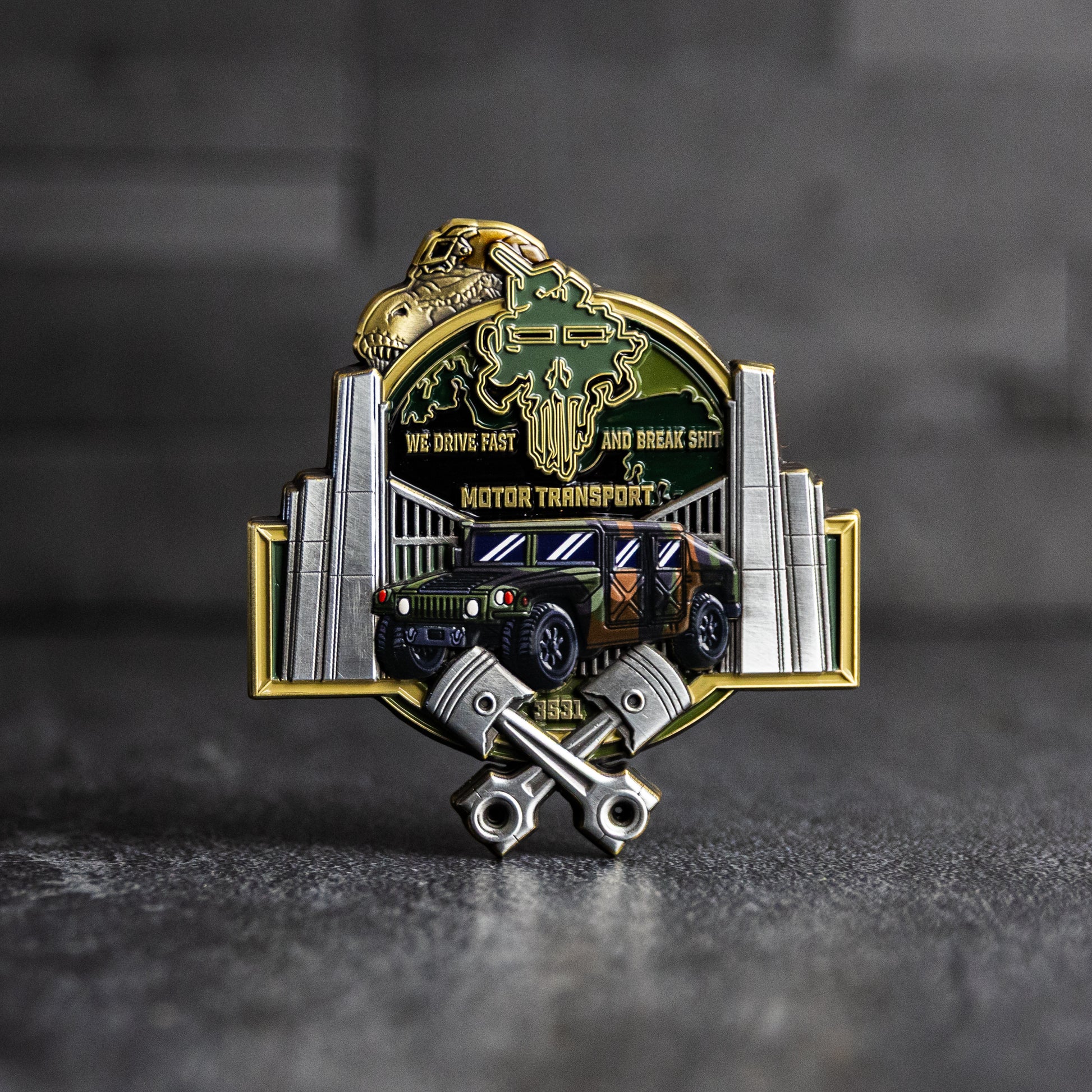 Built for the workhorses of the fight, the Motor T-Rex Challenge Coin represents the strength, grit, and relentless drive of Motor Transport and military vehicle operators. Like the T-Rex, Motor T dominates through raw power, endurance, and the ability to keep moving when everything else breaks down.